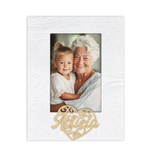 El Marco Mod. Aida 10×15 Abuela de IBIS vertical es un marco de madera de color blanco con vetas madera, decoración calada en relieve, con escritura Abuela, de mesa, apto como regalo para el día de la madre, ideal para celebrar aniversarios o cumpleaños, apto para el hogar y la oficina.