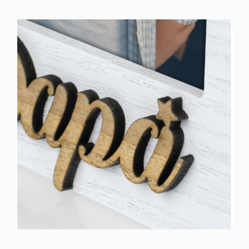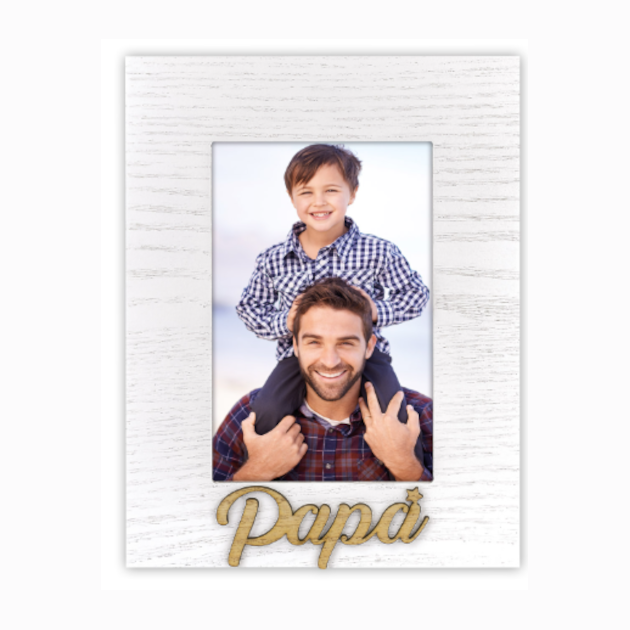 El Marco Mod. Stefano 10×15 Papá de IBIS vertical es un marco de madera de color blanco con vetas madera, decoración calada en relieve, con escritura PAPÁ, de mesa, apto como regalo para un día especial y para un papá especial, ideal para celebrar aniversarios o cumpleaños, apto para el hogar y la oficina.