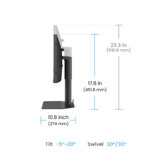 Posiciona tu monitor para un confort óptimo. Con una variedad de puntos de control de inclinación, giro y pivote, ya sea que estés trabajando en diseño o presentando tus ideas a clientes, siempre hay un lugar adecuado y el ángulo correcto para hacerlo.