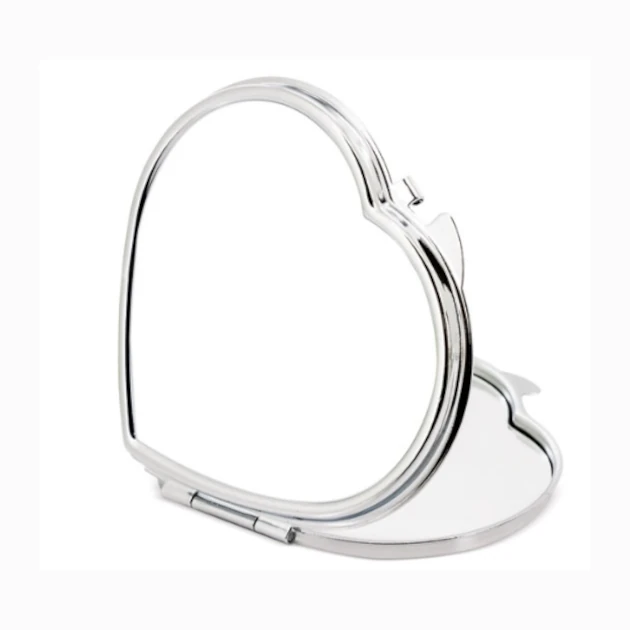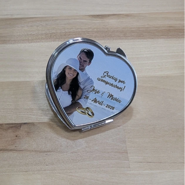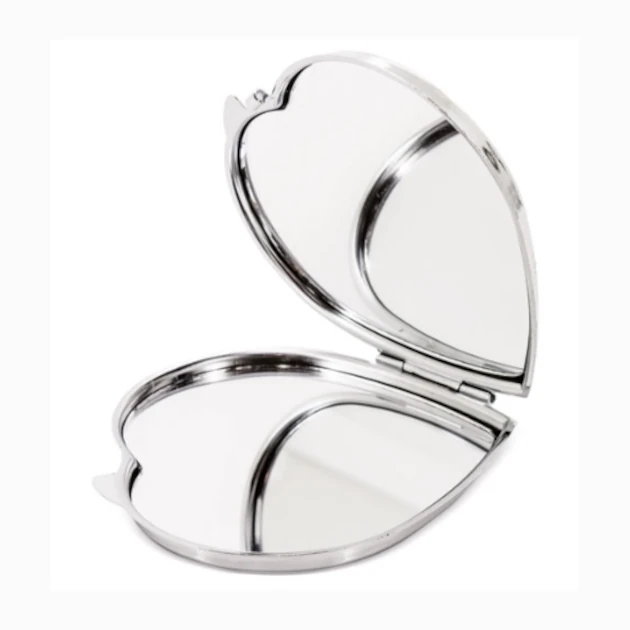 Espejo de Bolso forma Corazón 70x70mm personalizable con la técnica de sublimación. Perfecto como bonito y elegante detalle de un evento. Sus dos espejos interiores uno 1X y el otro 2X lo hace regalo super práctico.